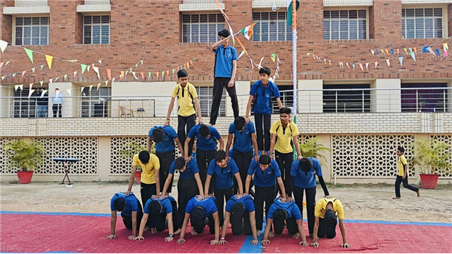 The celebration featured a harmonious choir performance, a thought-provoking skit highlighting the importance of civic sense, and a vibrant patriotic dance that captivated the audience. One of the highlights of the programme was the impressive pyramid formations performed by the students, symbolising teamwork, discipline, and collective strength.
